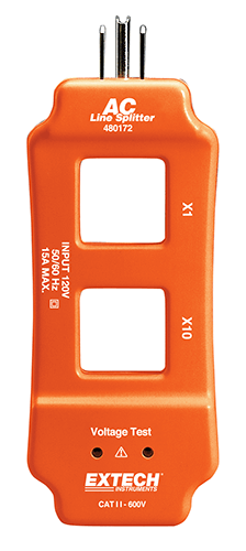 This Extech 480172 Line Splitter provides a fast and easy way to “open” standard 120 Volt AC electrical lines, eliminating the need to cut off the plug and separate the conductors. When connected between a 120 Volt AC outlet and a device under test, this splitter separates the hot/live conductor from the neutral and ground, which enables users to measure AC current up to 15 Amp on a two-wire or three-wire lines using a clamp meter. This splitter also features two Voltage Test jacks so that voltage can be measured using a multimeter.