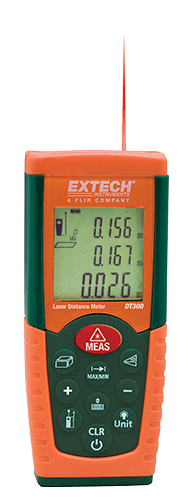 The easy-to-use DT300 Laser Distance Meter accurately measures from 2″ to 197′ and can calculate area and volume. The integrated Pythagoras theorem also allows for the user to take indirect measurements. Other features include continuous measurement function with Min/Max distance tracking updates every 0.5 seconds, addition/subtraction, and front or rear edge reference. The DT300 has a double molded housing (IP54), low battery indicator, auto power-off function and comes complete with a carrying case and 2 AAA batteries.