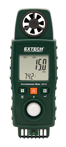 Convenient 10-in-1 Environmental Meter measuring Air Velocity, Air Flow, Air Temperature, Type K Temperature, Heat Index, Humidity, Wet Bulb, Dew Point, Windchill, and Light Level. Includes built-in low friction ball bearing mini vane wheel, a precision photo diode with cosine and color correction filter, and a capacitive humidity sensor for high accuracy. The Type K input accepts standard Type K Thermocouple probes to measure surface temperature up to 2372°F (1300°C). Features large dual LCD with backlighting, Data Hold, and Min/Max function