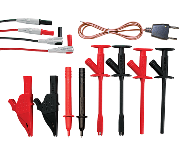 The Extech TL833 Industrial Test Lead Set is a 12 piece kit with a CAT III-1000V rating. This set includes the TL726 double molded silicone test leads, the TL740 industrial plunger style test clips and the TL741 heavy duty plunger style hook clip set. Set also includes the TL708 alligator clip set, the TL743 slim reach test probe set and the TP873 type k bead probe with banana adaptor. The Extech TL833 Industrial Test Lead Set is conveniently stored in a pouch case which helps keep it organized and safe.